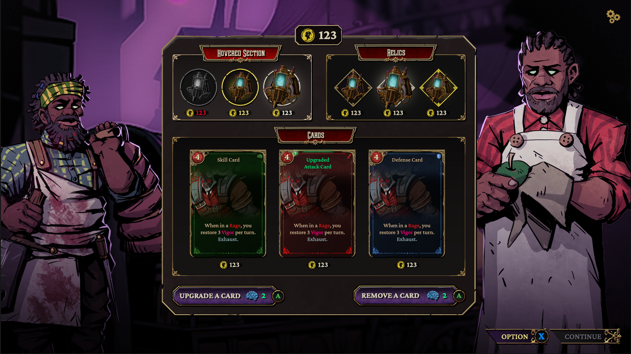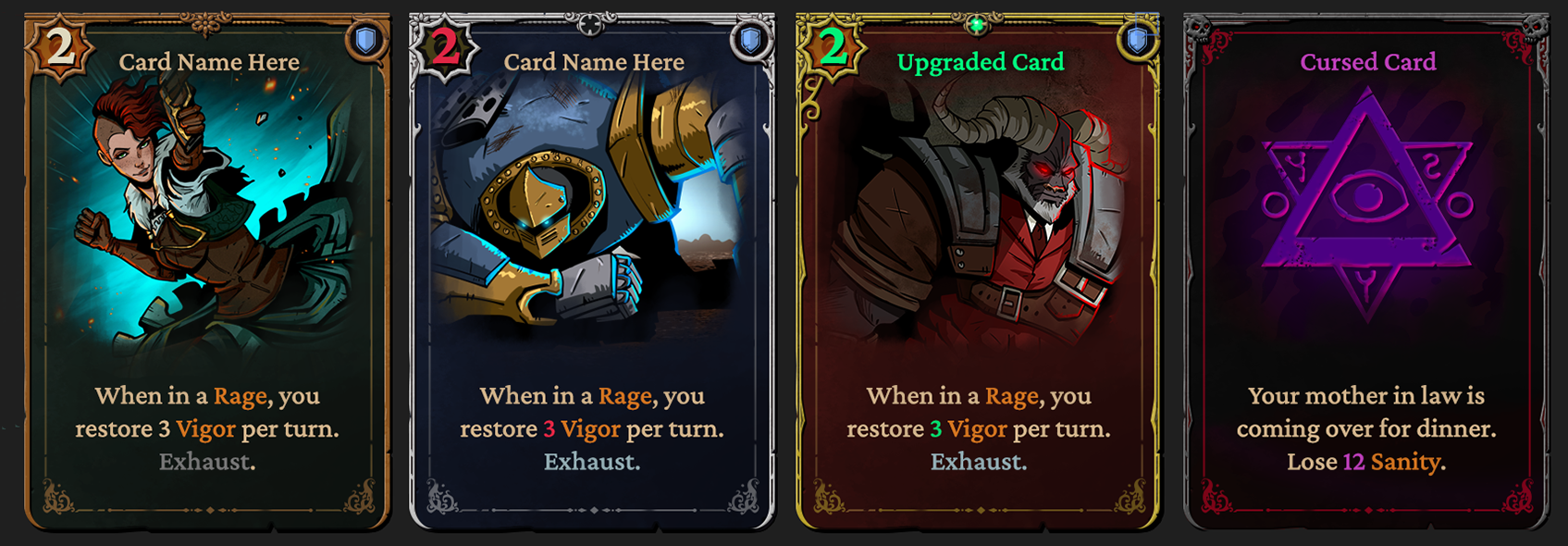 I settled on character stats, relics and tarot cards on the top left where the eye first rests, while any consumable or ability-type interactions were moved to the lower left where the players current Energy is displayed. All other card information occupies the bottom center and right frames. The top right of the screen was left for the settings menu, and any relevant resource displays that may have been required.