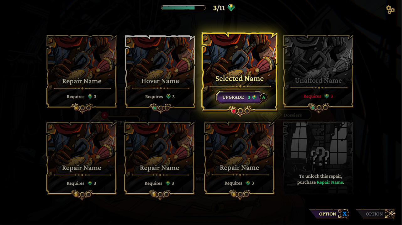 We would keep the visual design largely minimal and use few colors, matching the art style and theming of the amazing assets being designed by the art team - and take a risky gamble in replacing the core UI code with a custom system designed in-house by Zugalu to allow us to do what we wanted with interaction animations and narrative.